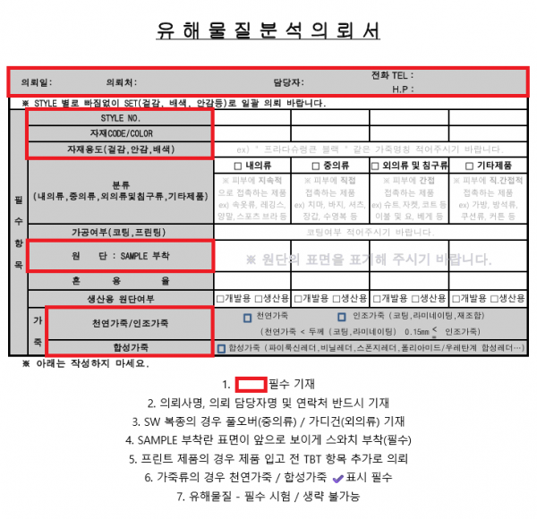 유해물질 의뢰서 작성 방법(필수 시험 : 원단, 가죽 공용 사용)